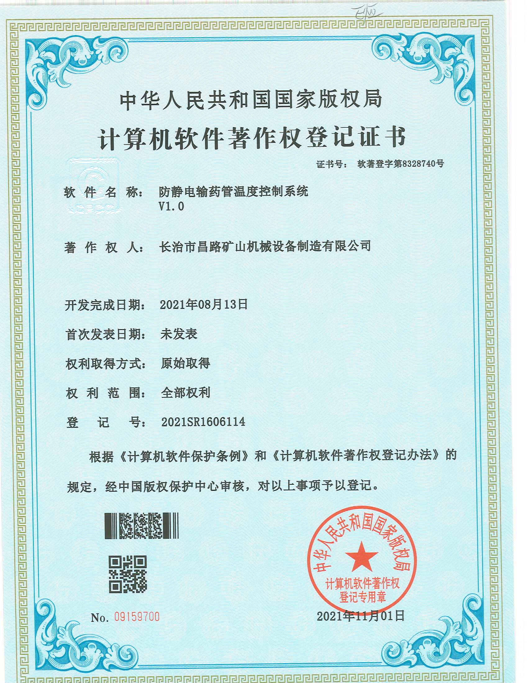 防靜電輸藥管溫度控制系統(tǒng)著作權(quán)登記證書(shū)